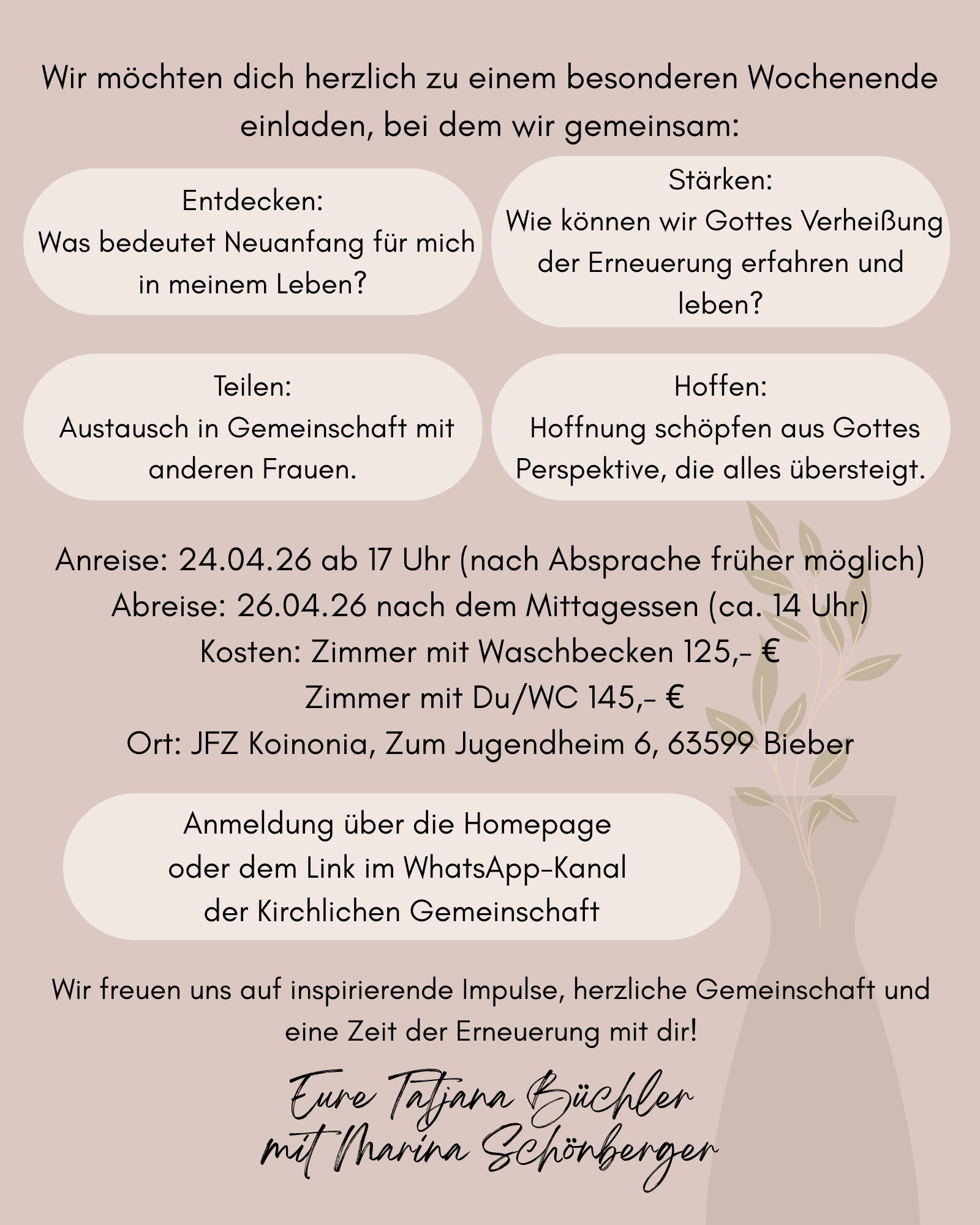 Du bist eingeladen, einen Schritt aus dem stressigen Alltag zu wagen, um zur Ruhe zu kommen, den Austausch mit anderen Frauen in einer gemütlichen Teerunde zu genießen oder einfach bei einem Spaziergang deine Schöpfer zu begegnen. Vor allen Dingen darfst du dich durch Gottes Wort und verschiedene Vorträge und Bibelarbeiten ermutigen und zurüsten lassen, damit du motiviert, im Glauben gestärkt und strahlend wieder in deinen Alltag zurückkehren kannst.